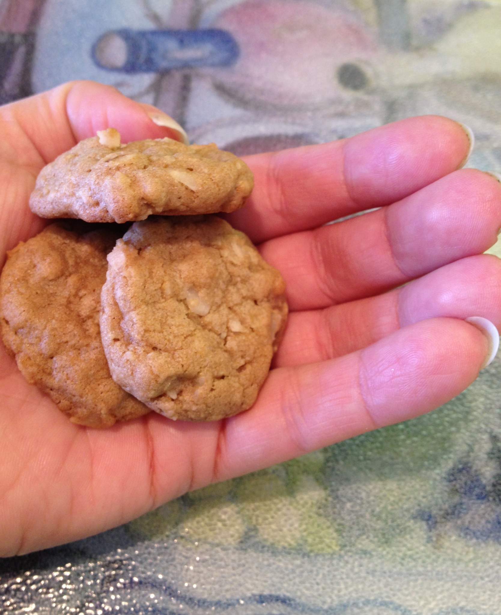 I love love love oatmeal cookies (but only those without raisins) and could eat brown sugar straight out of the jar it’s so delicious. And then there’s coconut. Delicious crunchy flaky coconut bits that remind me of sitting on a beach drinking one of those drinks where the top of the coconut has been hacked off. In other words this cookie is a culmination of 3 of my favorite things. It’s soft. It’s chewy. It has a little crunch from the coconut chips. Look-you can see the bits of the oatmeal and coconut flakes right there in the cookie. I know I was helping myself to the raw batter-bet you will too. Make them. Today. Right now.