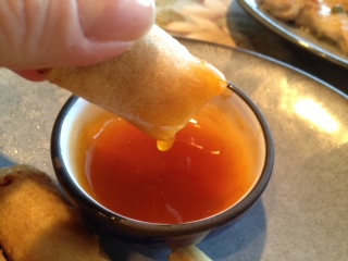 I cooked this down longer than the original recipe instructed as I wanted it to be a little thinner-more of a glaze consistency as you can see below. I heated up some spring rolls that I had in the freezer but you could put this on anything-grilled chicken, shrimp etc…
