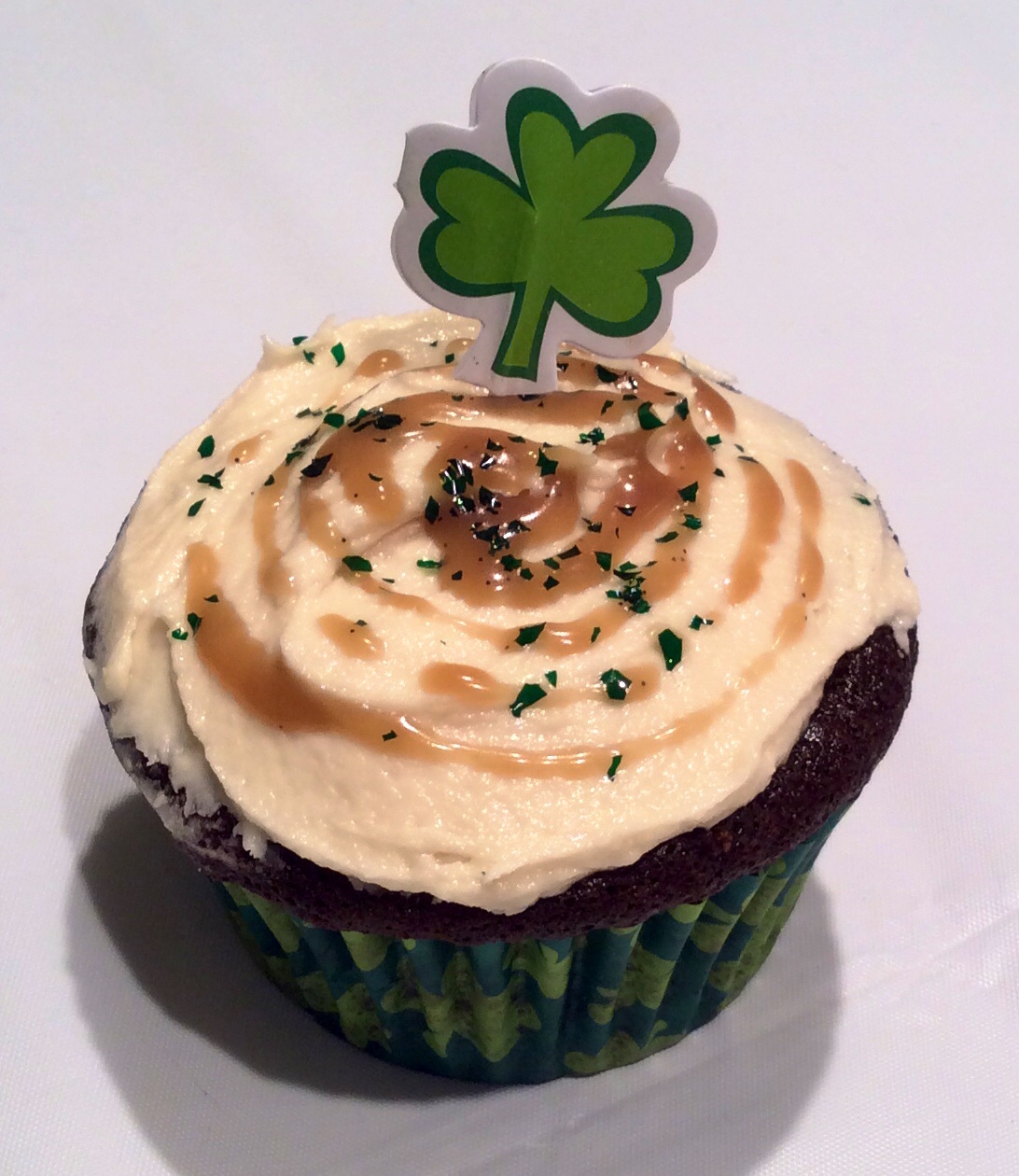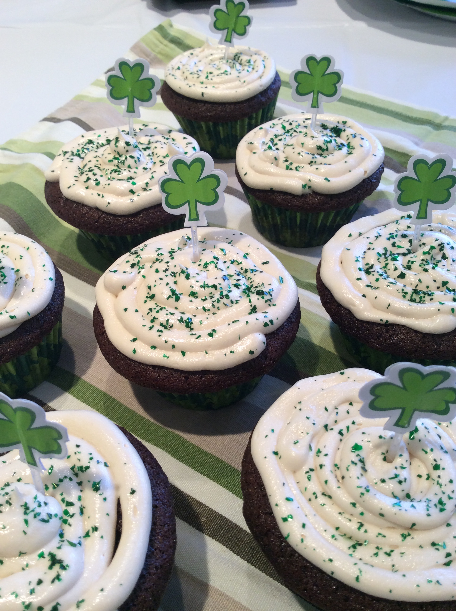 So I thought. And thought. And thought. And thought about how I could incorporate it into something yummy but a bit different. I determined that I didn’t want to do a Guinness cupcake (no offense to Guinness-you’re my favorite beer) but everyone does that. So I thought ‘what do I like with my Bailey’s’? Coffee! And chocolate! PERFECT! So there was the cake flavor. But then the frosting. Bailey’s is pretty heavy stuff so I decided on a buttercream but I made it nice and light by also incorporating heavy cream. Yummy. Then I thought back to many Christmas celebrations at my In-laws and remembered that my Husband’s Grandmother used to make Buttery Nipple shots-Bailey’s and Butterscotch Schnapps. There was the bit of goodness that would tie this all together. Throw on a bit of edible green glitter and it’s perfect.