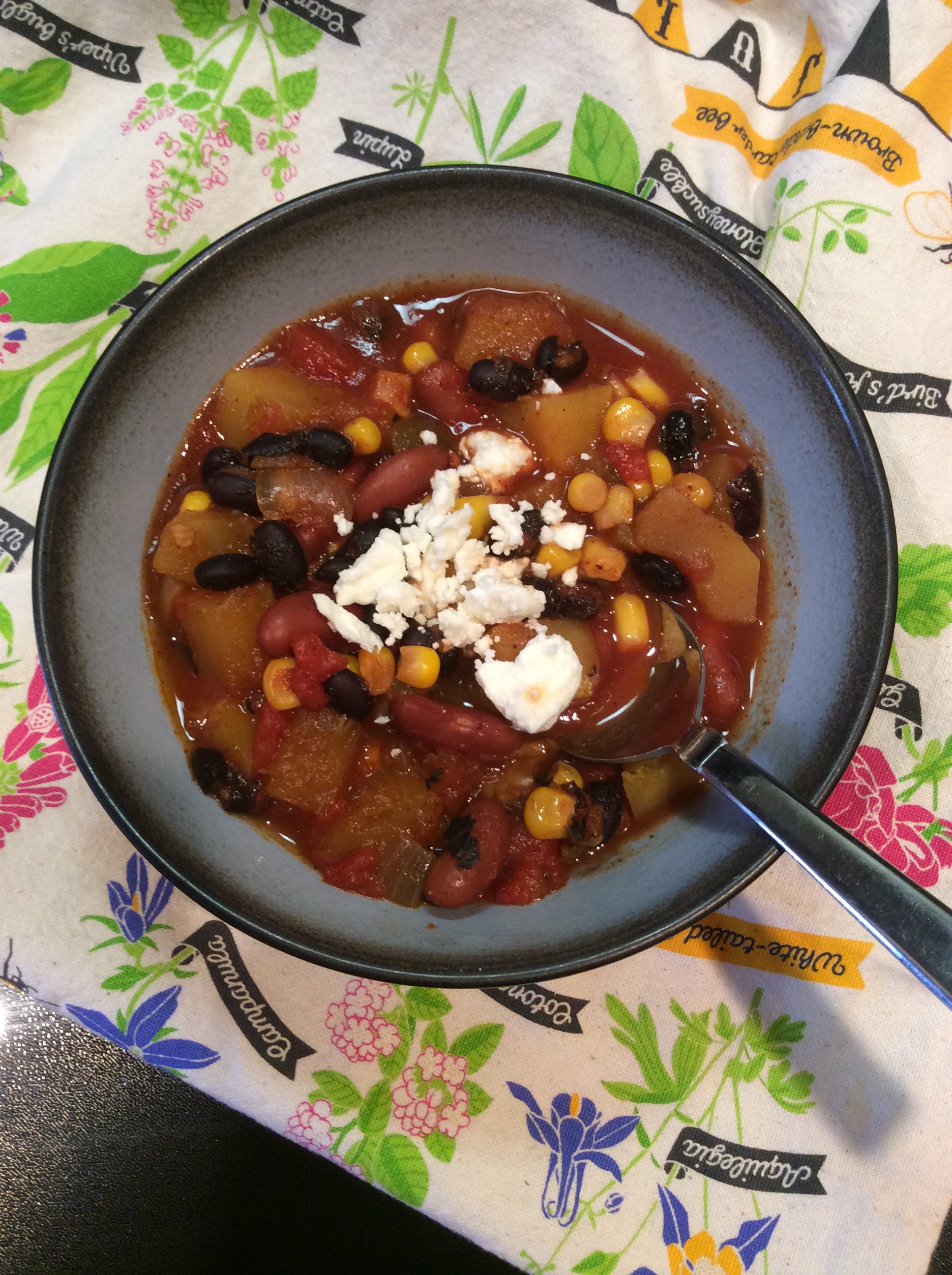 Even though there’s still summer left last Saturday started cold and rainy. So naturally chili came to mind immediately. The result of pulling different items from my pantry was delicious! Just enough heat, different tastes and textures and it’s very very very good for you.