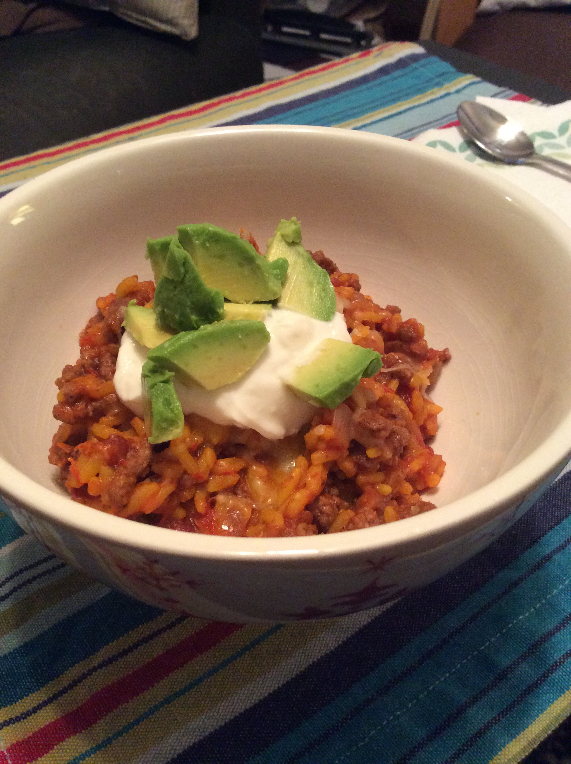 This one-pan meal is very delicious and very easy to make. It’s a big mash-up of yummy–ground beef, rice and beans, spices and cheese. You probably have most, if not everything, to make this in your pantry already. I love weeknight dishes that I can set to simmer for a few minutes-it allows me to clean everything up while it finishes cooking.