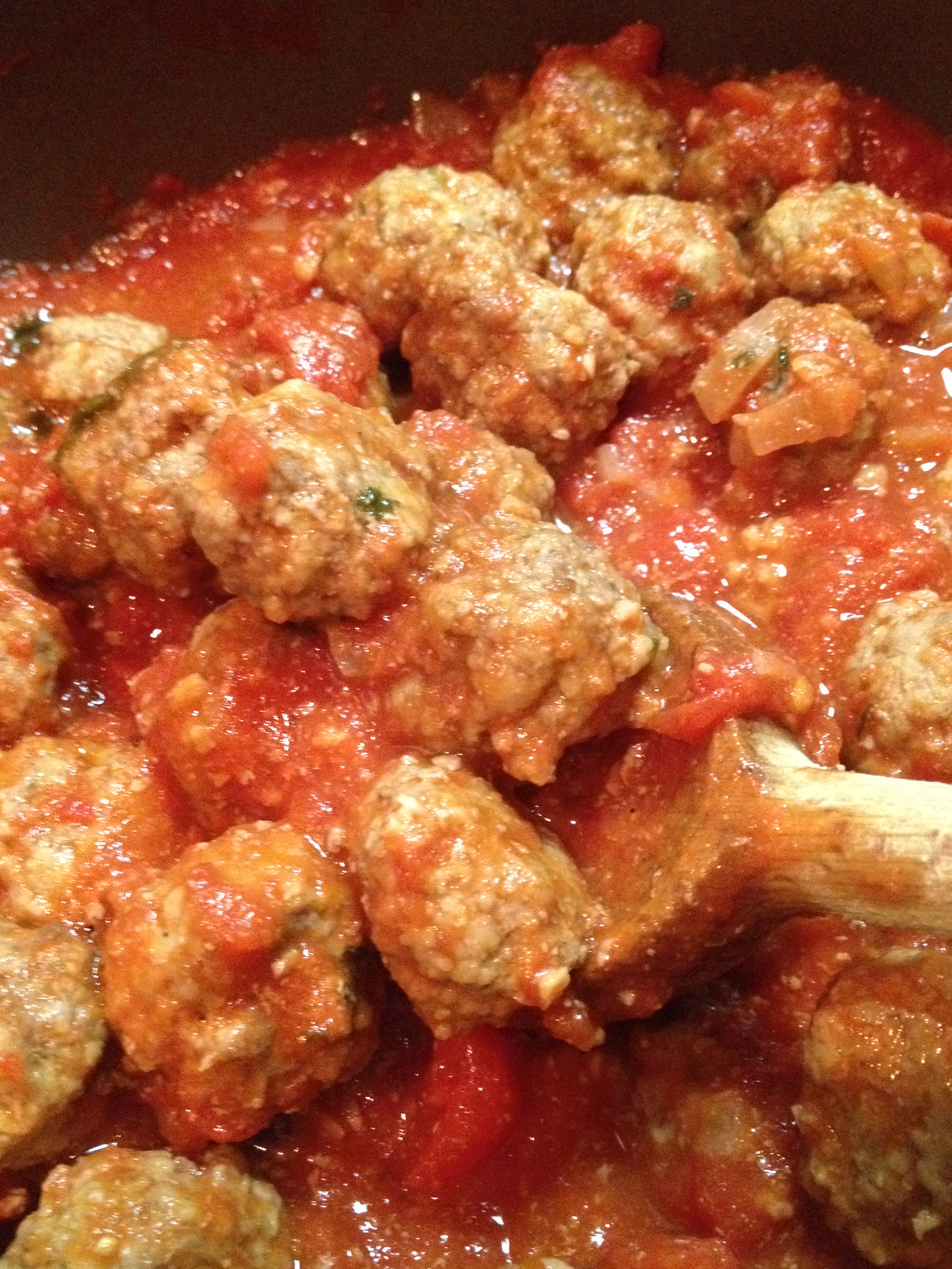 - 3. Meanwhile, heat the oil, onion and garlic in a medium saucepan over medium heat until the garlic starts to sizzle, about 2 minutes. Stir in the tomatoes and simmer until the sauce thickens slightly, 10 to 15 minutes. Off the heat, stir in the remaining 3 tablespoons basil and season with salt and pepper to taste. Stir in the meatballs and cover to keep warm.