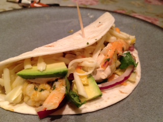 Makes 4-5 small soft tacos. Dressing for shrimp and slaw courtesy of foodnetwork. The rest and assembly is all mine.